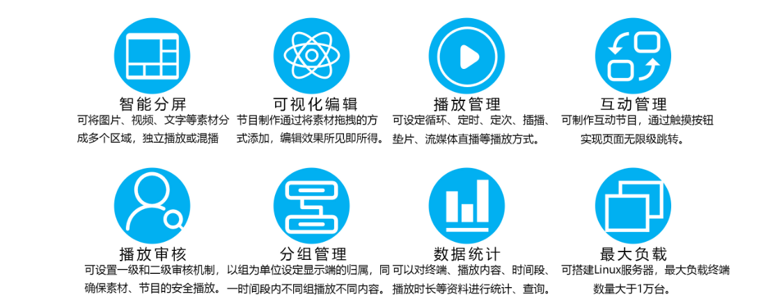 可搭建Linux服務器;最大負載終端數量大于1萬臺;支持多點同步播放;支持電視信號輸入。